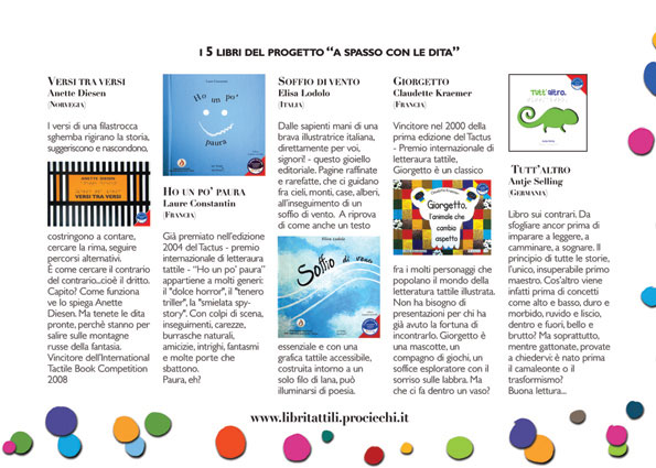 È un progetto triennale che si svolge su tutto il territorio italiano a sostegno della lettura per l’infanzia e della lettura integrata e che intende offrire gratuitamente, alle strutture istituzionali impegnate nella promozione della lettura, una collezione di 5 libri tattili per la prima infanzia con doppio testo nero-braille e illustrazioni a rilievo.