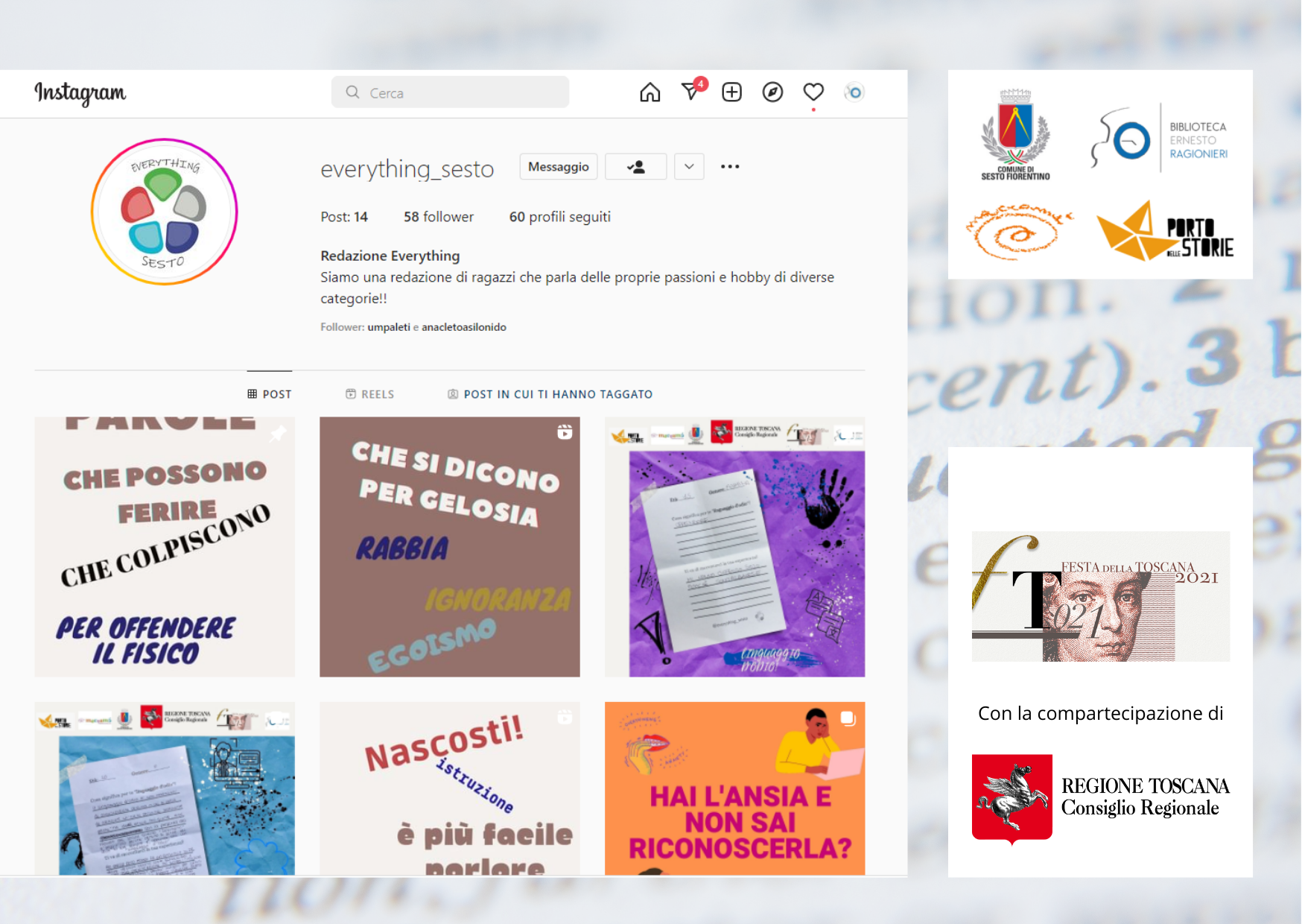 E' formata da 11 ragazzi che frequentano le scuole superiori del territorio, a lavoro da alcuni mesi su una tematica importante e molto attuale: i linguaggio d'odio, la violenza verbale che si scatena in rete ma anche nella vita di tutti i giorni, nelle strade, a scuola, in famiglia. La giovanissima redazione Everything_sesto, che ha la propria base operativa presso la Sala Giovani della Biblioteca Ernesto Ragionieri, è nata a Gennaio 2022 grazie al progetto Yes We Care. Raccontare per costruire realizzato con Cooperativa Macramè - Il Porto delle Storie, un percorso di digital writing che ha come obiettivo primario dare voce ai ragazzi valorizzandone lo stile e i talenti narrativi attraverso esperienze, formazioni, attività di gruppo e incontri. I partecipanti si sono incontrati tutti i giovedì pomeriggio e hanno dato vita ad un profilo Instagram (Evenrything_sesto) nel quale condividono contenuti, parole, immagini, riflessioni, video realizzati lavorando su una comunicazione positiva e responsabile. Tra Aprile e Giugno i giovanissimi redattori hanno lavorato alla realizzazione di una campagna di comunicazione sul contrasto ai linguaggi d'odio grazie al progetto Parole contro l'odio che ha ricevuto il finanziamento del Consiglio Regionale della Toscana per il bando Festa della Toscana 2021. Attraverso interviste e questionari hanno raccolto le esperienze e le riflessioni dei propri coetanei e concluderanno il percorso con la visita al Bologna Pride 2022, sabato 25 giugno, un'occasione per incontrare e intervistare alcuni attivisti impegnati nella difesa dei diritti e nel contrasto all'odio nei confronti della diversità.