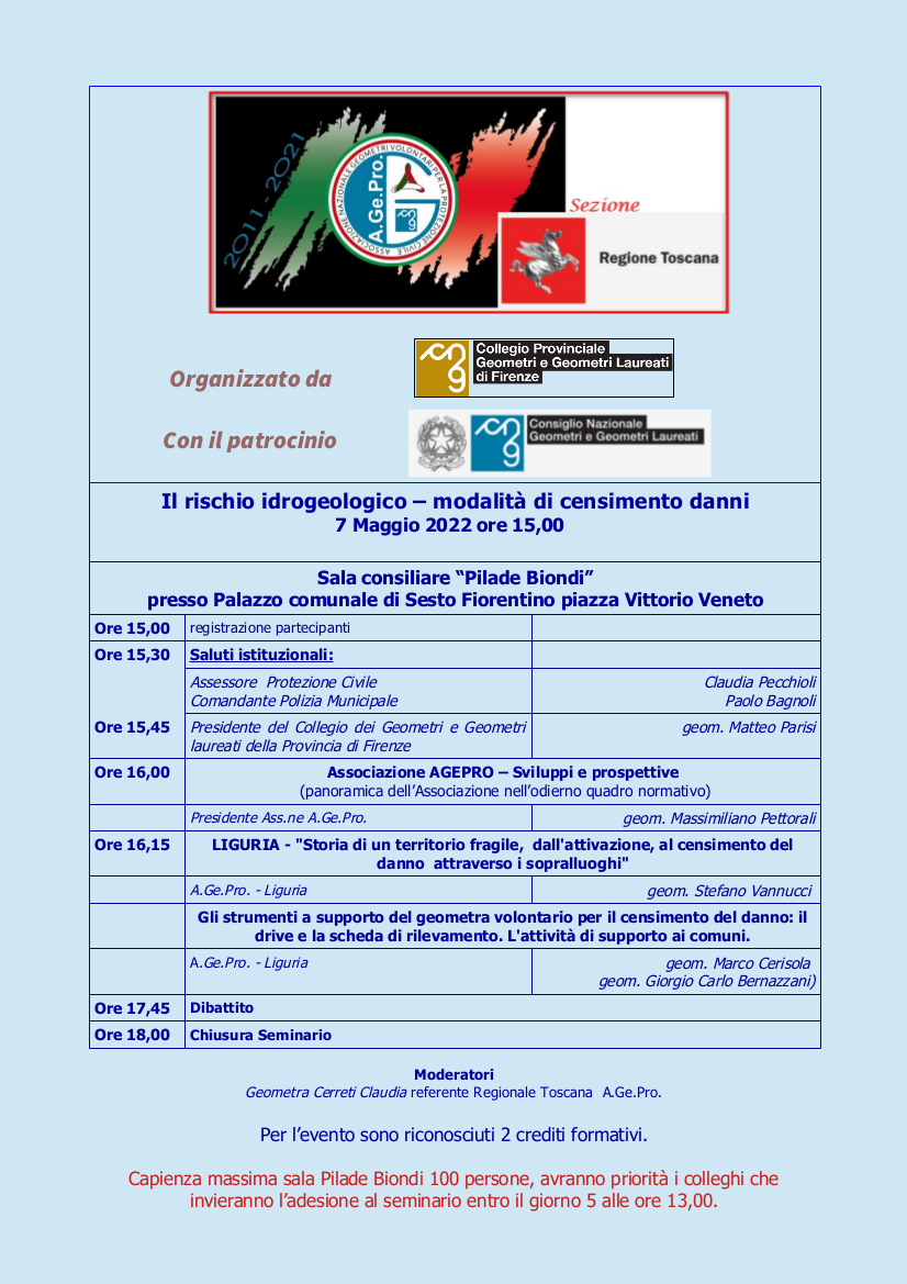 - Collegio dei Geometri che porteranno i rischi idraulico e sismico